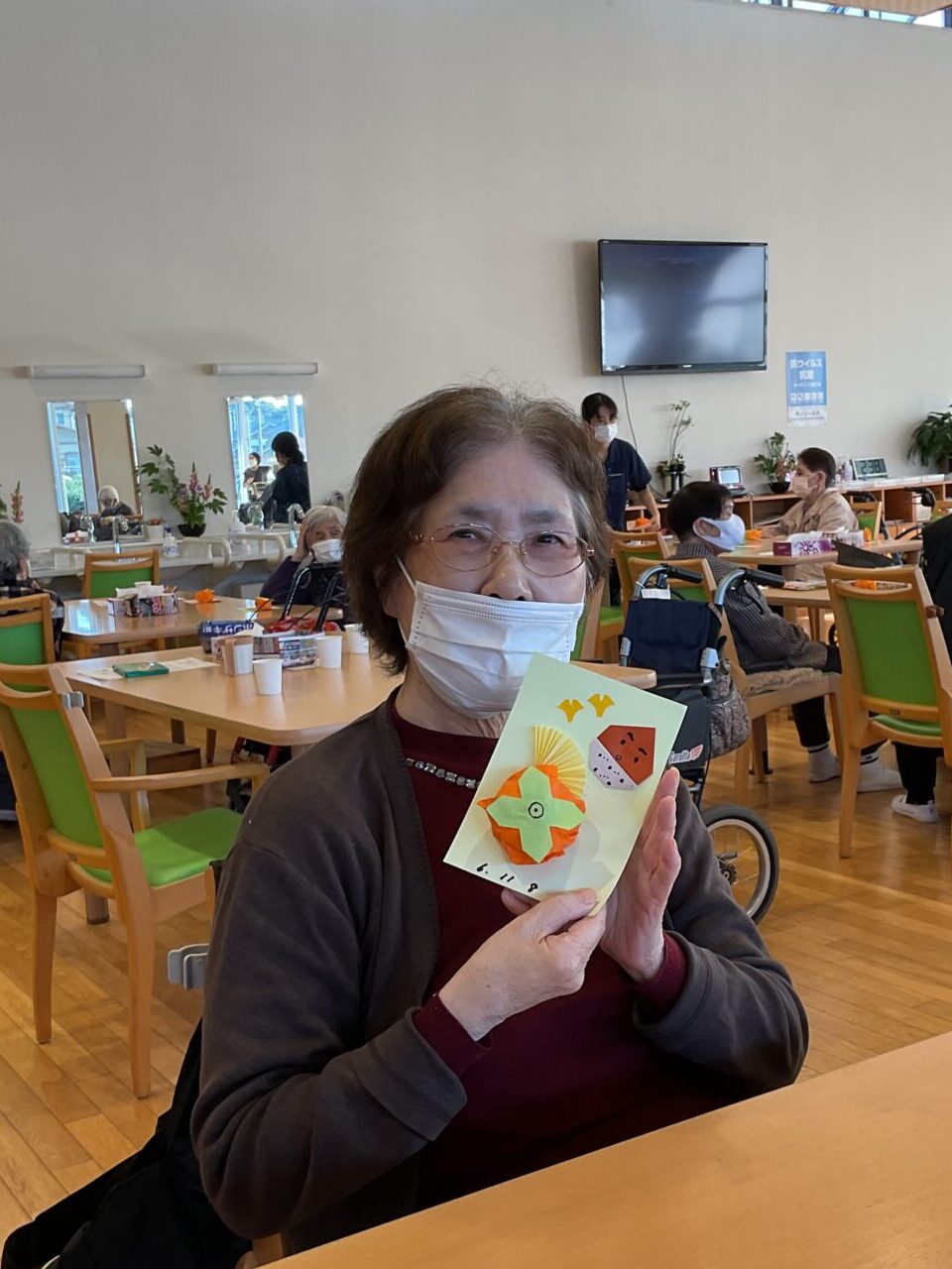 ご利用者様自身で、台紙にイチョウと栗の折り紙や新聞紙で作った立体的な柿を飾り付けていただきました🌰
