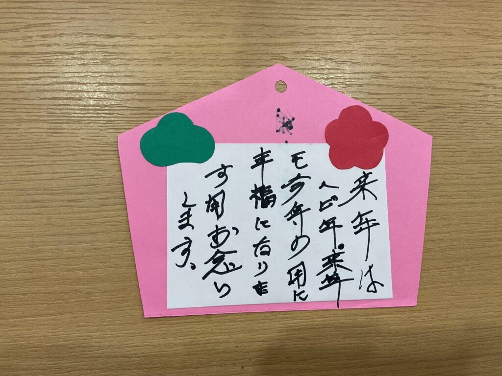 絵馬を作りました🐍⛩️ 投稿日 2024年12月17日 更新日 2025年4月3日 著者 通所介護事業所 ハートヒルかわげR23 カテゴリー スタッフブログ ハートヒルかわげR23です😄本日は創作レクリエーションで絵馬を作りました!皆さん、絵馬の台紙に飾りを張り付け、思い思いに願い事を書いていただきました☺️健康や幸せについて書かれる方が多かったです😌お金が欲しい!と書かれている方もいらっしゃいましたよ😁💰みなさん、いつまでもお元気で長生きしてくださいね☺️🌸創作レクリエーションに興味がある方は、ぜひハートヒルかわげR23で楽しみませんか?体験は無料です🖐️ ハートヒルかわげR23