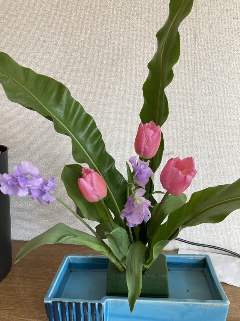 チューリップのピンクと、スイートピーの藤色でとても春らしい生け花、お部屋に飾るのが楽しみですね