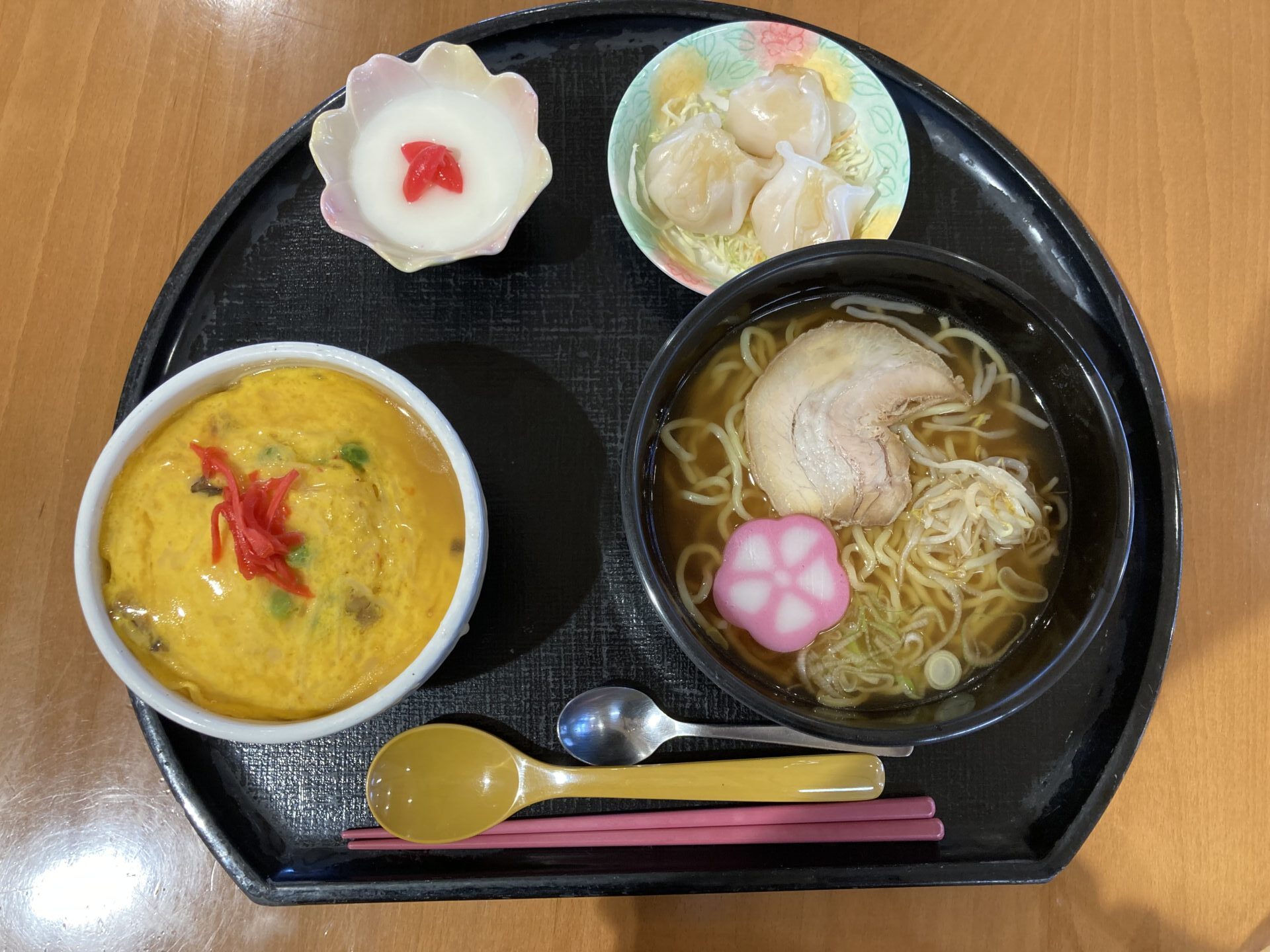 お誕生日御膳🍴 投稿日 2025年4月10日 著者 通所介護事業所 ハートヒルかわげR23 カテゴリー スタッフブログ ハートヒルかわげR23です🐰先日のお昼はお誕生日御膳でした✨お写真はこちら!!⇩醤油ラーメン、天津飯、エビシューマイ、杏仁豆腐です🤗ボリューム満点でお腹いっぱい🤣とのお声を多くいただきましたよ!今後の献立も工夫を凝らしていきますので、ぜひお誕生日御膳の日の追加利用もお考え下さい🌷 ハートヒルかわげR23