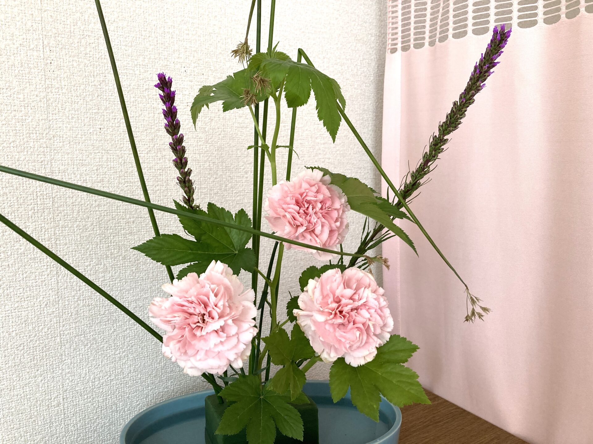 今回は細いけどフトイ、紫色のリアトリス、華やかなピンクのカーネーションに、