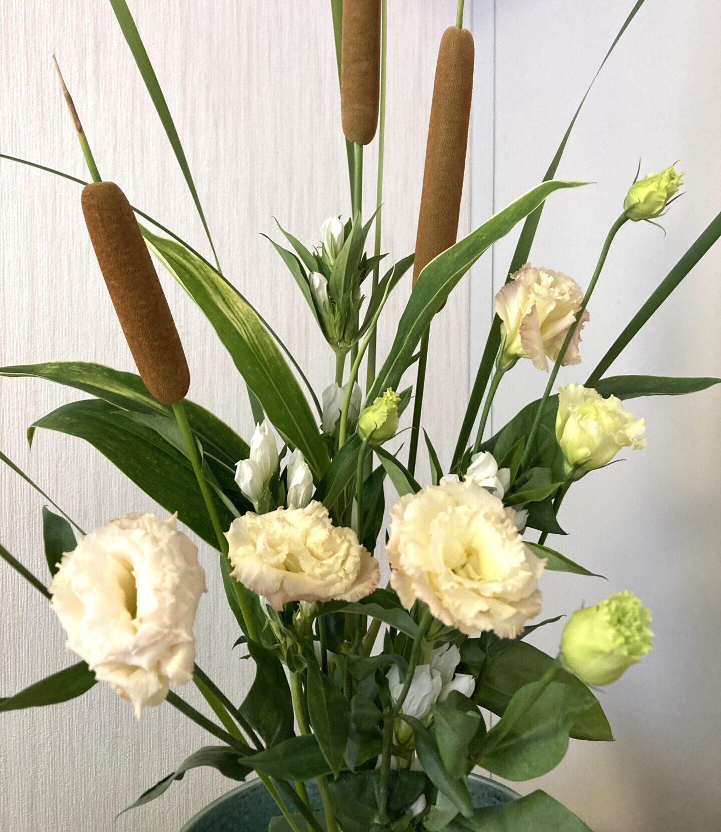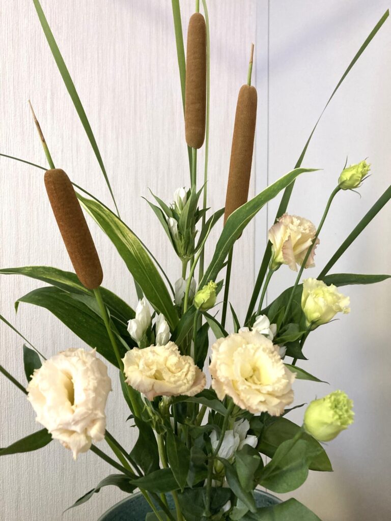 水辺で見かけるガマや、白のリンドウ、フリルのピンクが美しいトルコ桔梗、ドラセナが届きました。