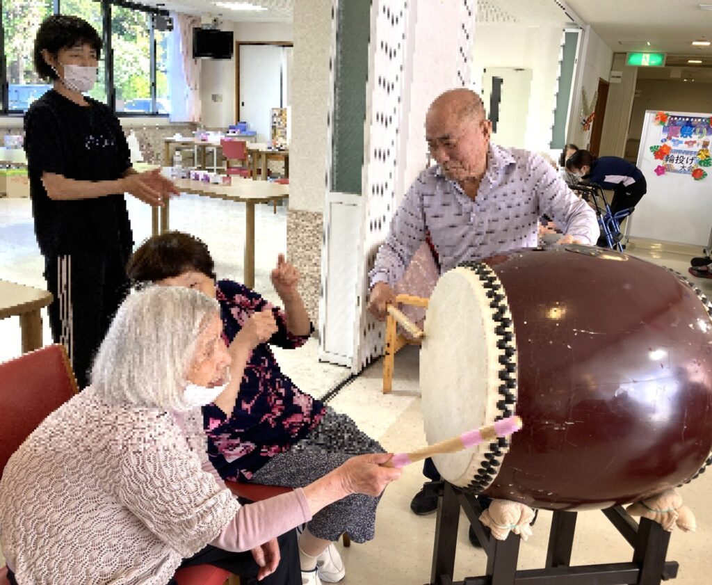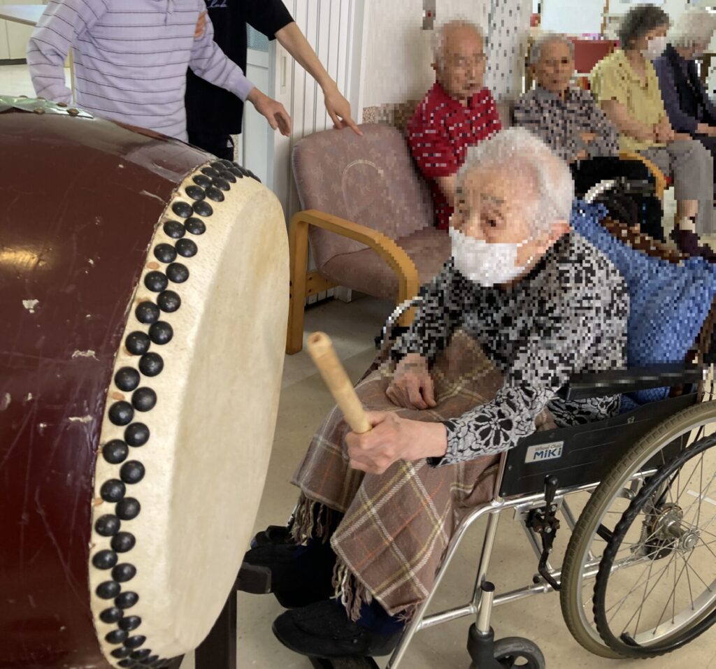 音楽に合わせて太鼓を叩いたり