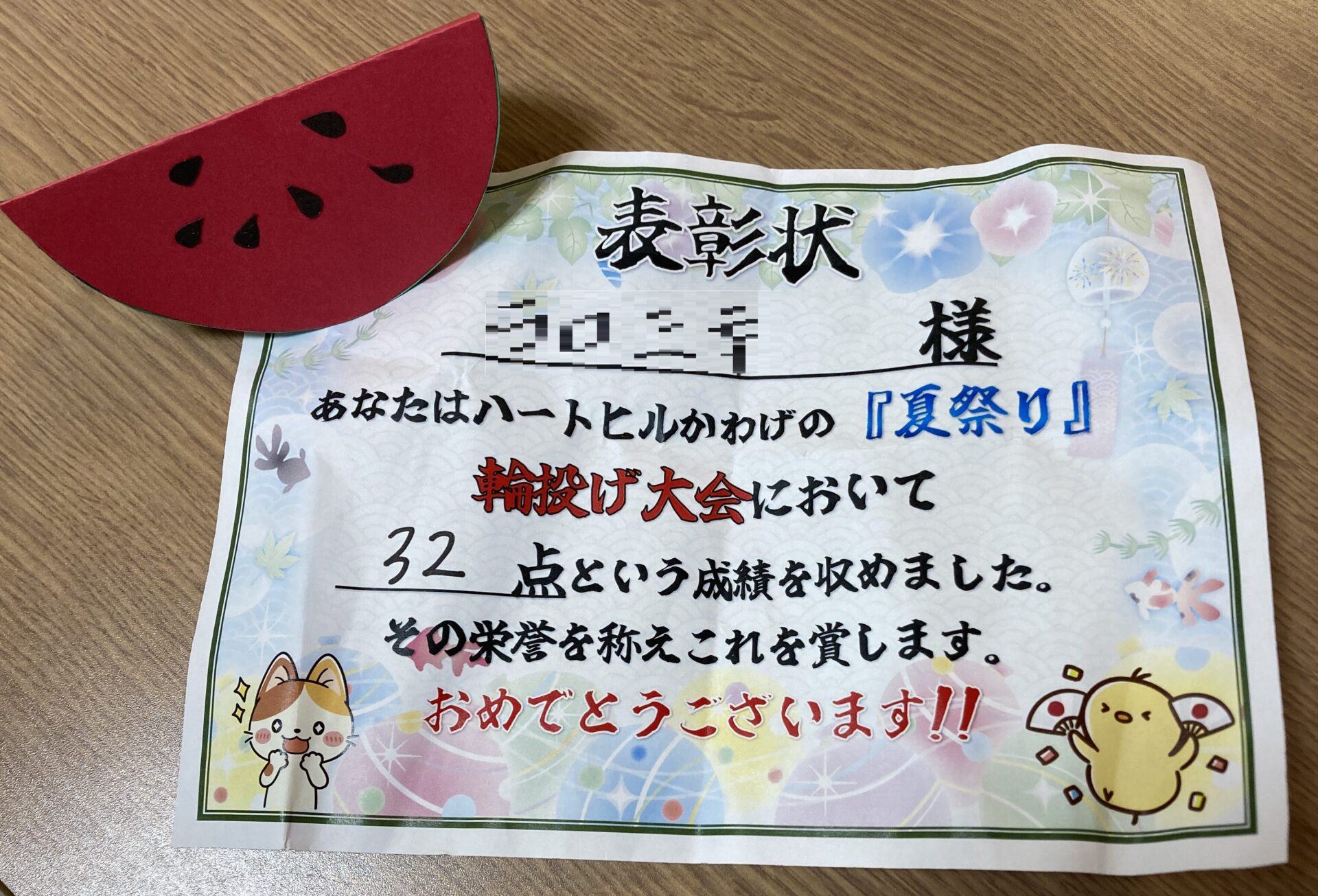 優勝者様には、スイカと表彰状を、