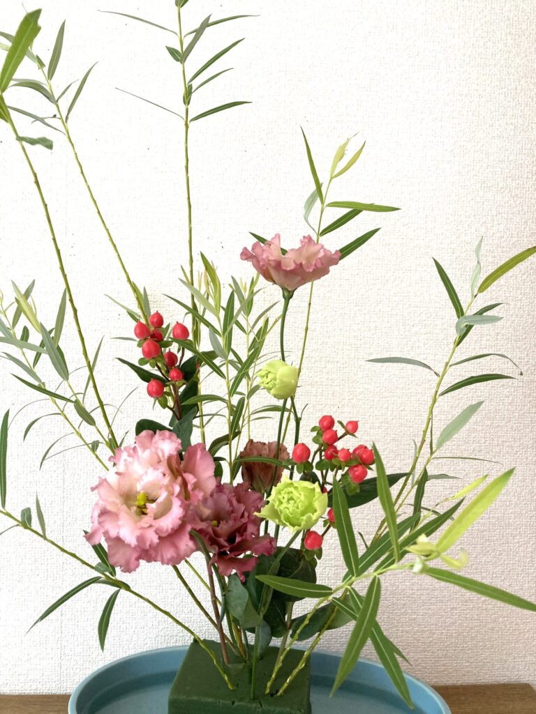 今回は涼しげな枝葉の行李柳とシックなピンク色が美しいトルコ桔梗、