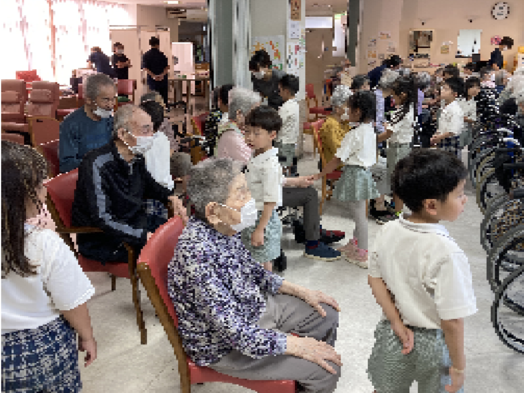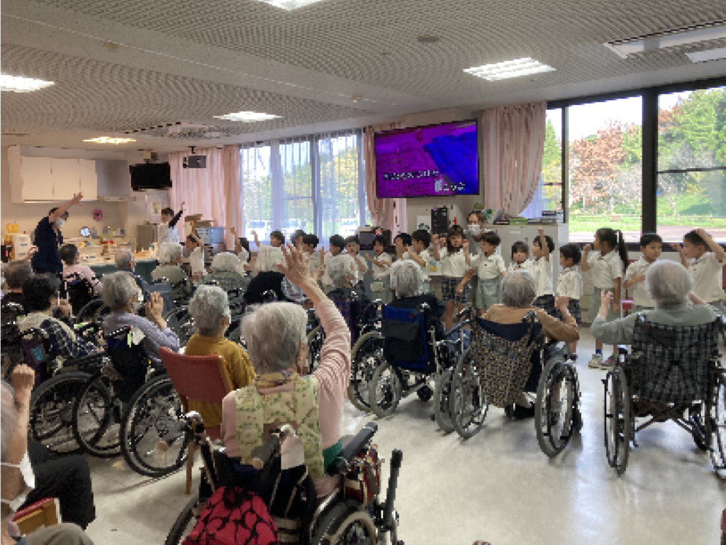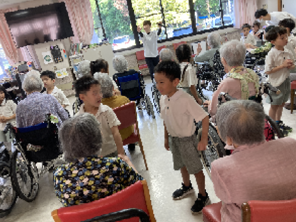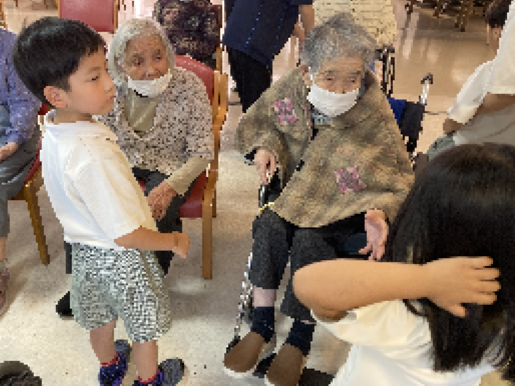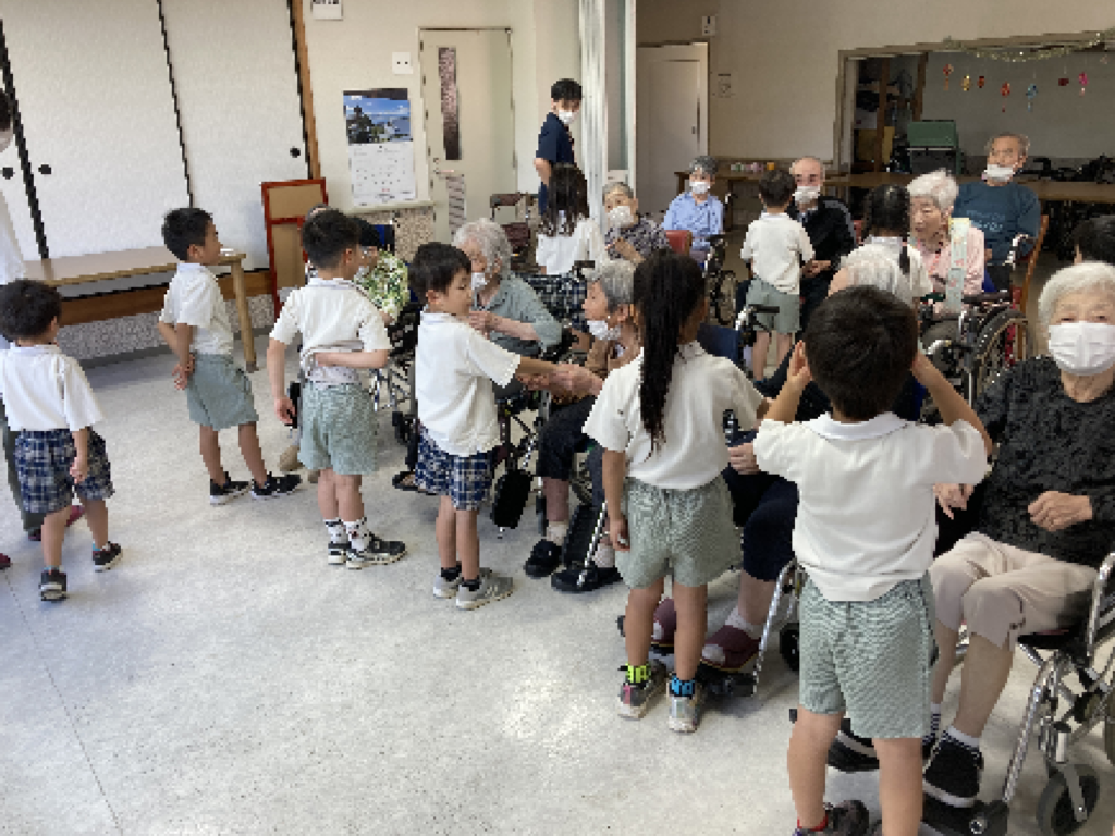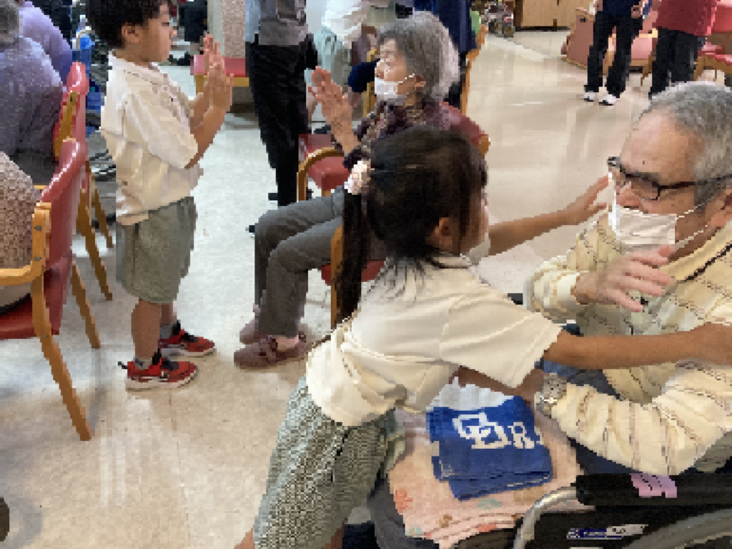 一人ひとりの子どもたちが入所者様のもとへ伺い、元気いっぱいにご挨拶と自己紹介。その後は、おしゃべりを楽しんだり、「幸せなら手をたたこう」の歌にあわせて手をたたき合ったり、肩をポンポンと優しくたたいたりと、笑顔があふれるひとときとなりました。