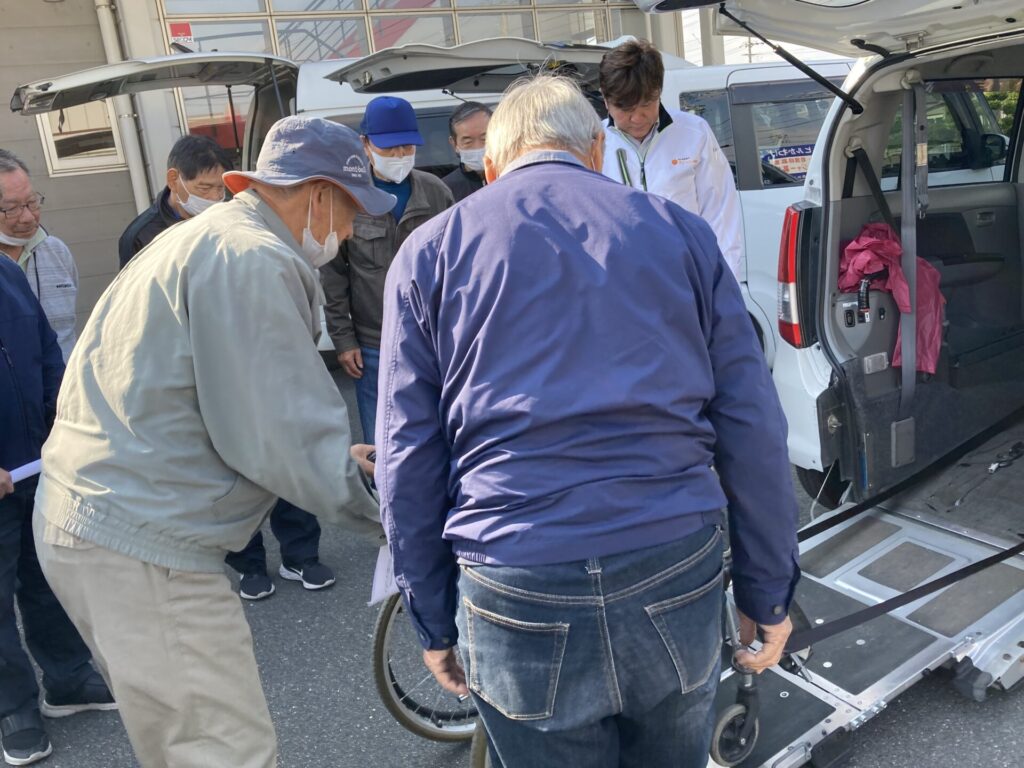 車いすの固定方法についても、運転手の方に普段通り実践していただきながら、より安全に固定するためのポイントを教わりました。