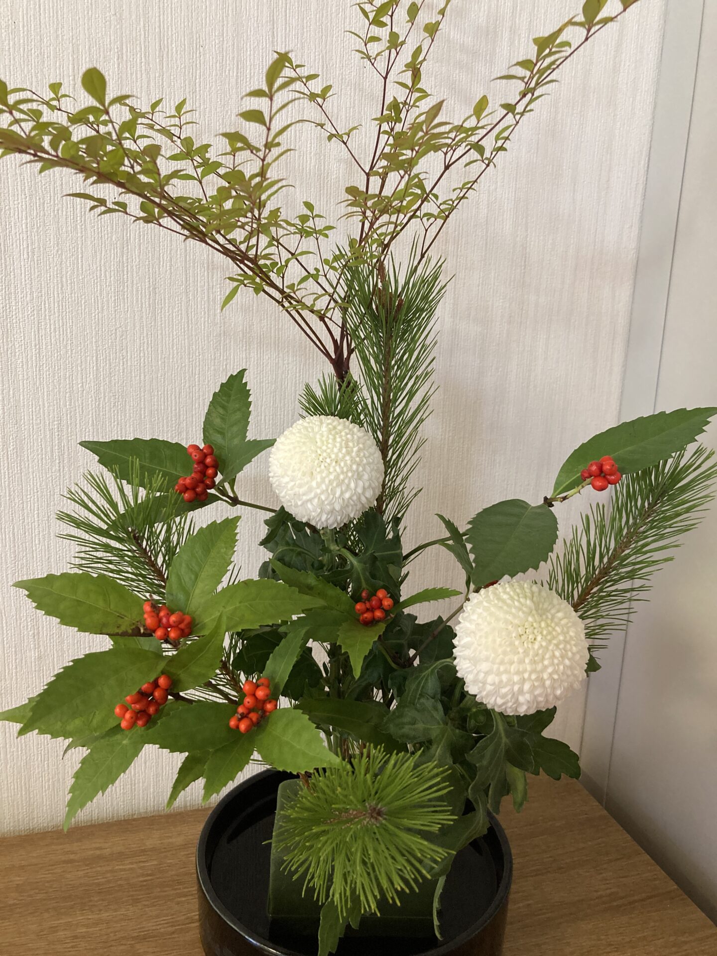 松に南天、ピンポンマム、千両とお正月にふさわしい花材が届きました。