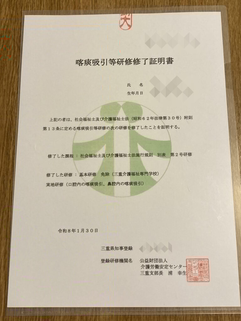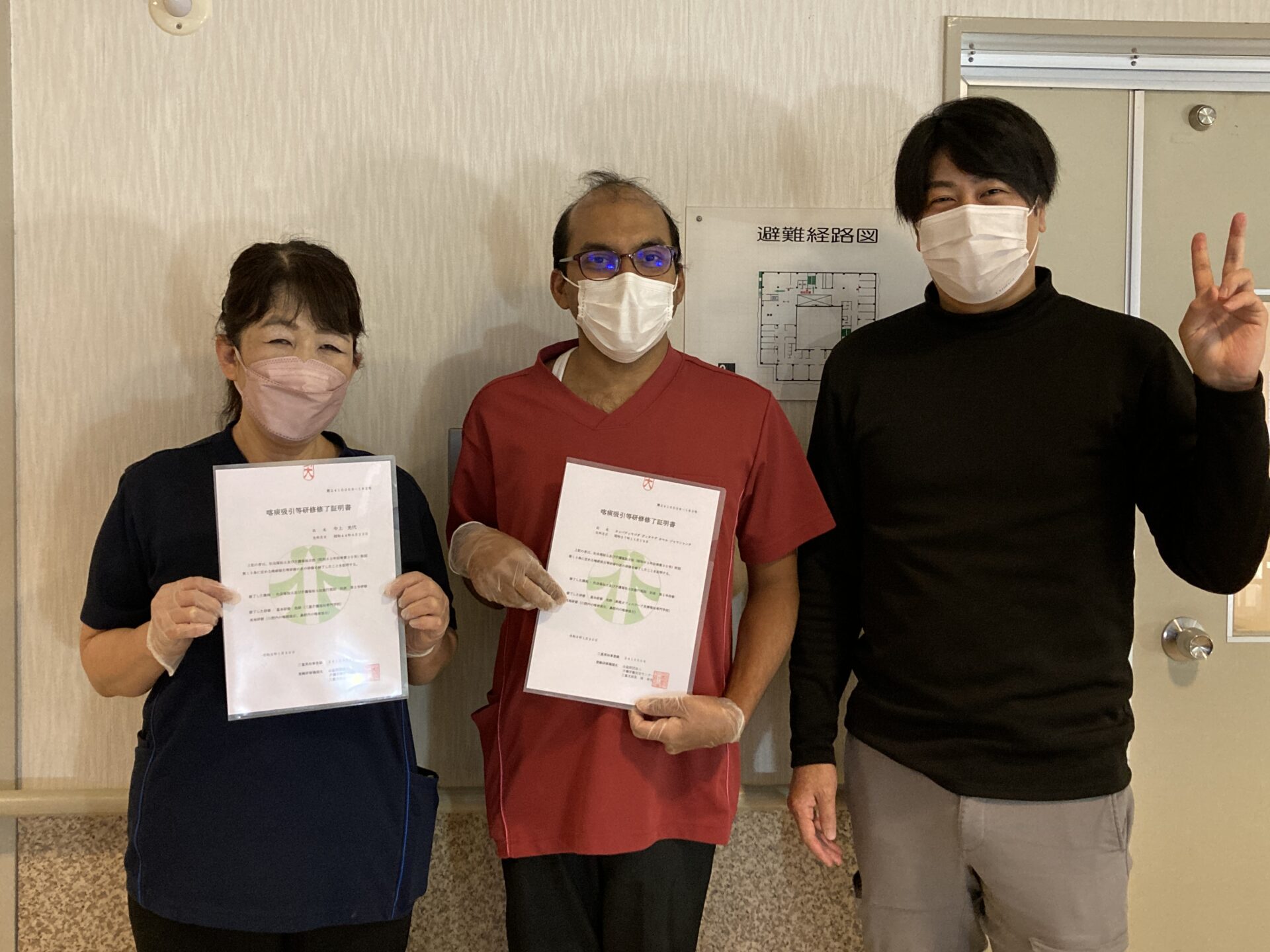 このたび、特養の職員が喀痰吸引研修を受講し、無事に修了いたしました。