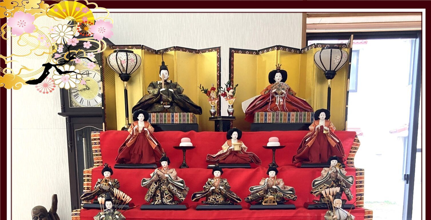 春の訪れを感じさせるやさしいお顔のおひな様とおだいり様が、畳ホールを明るく彩っています。