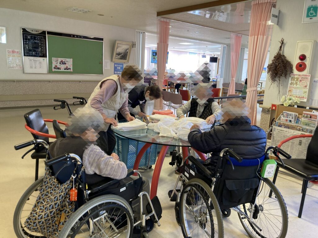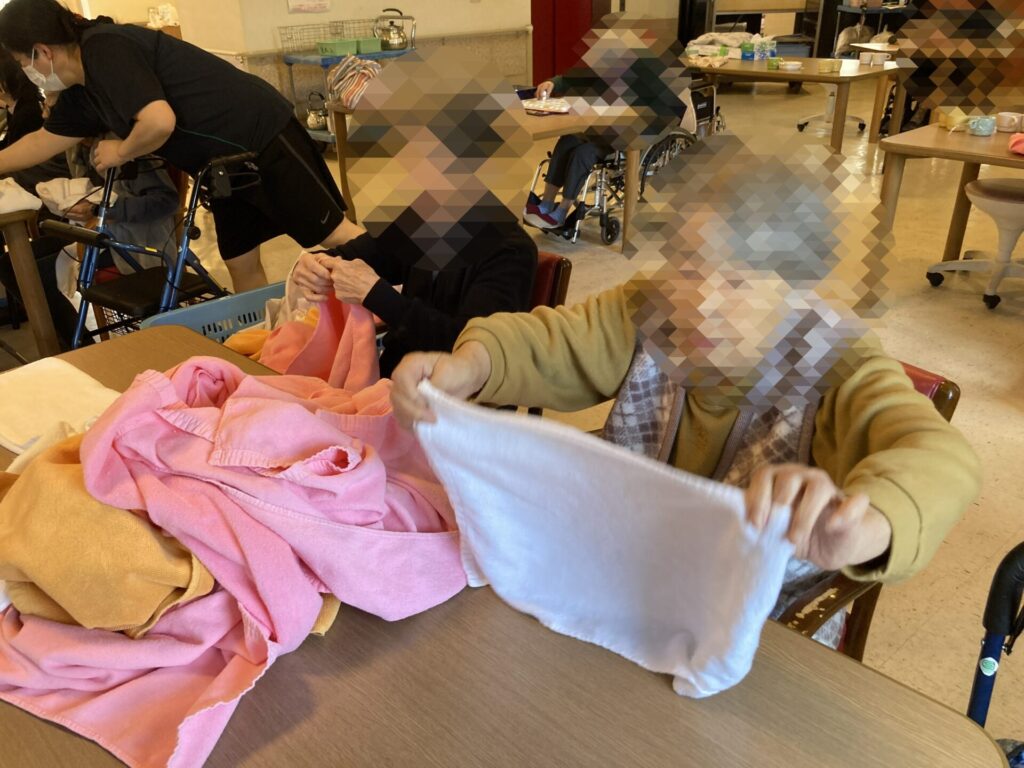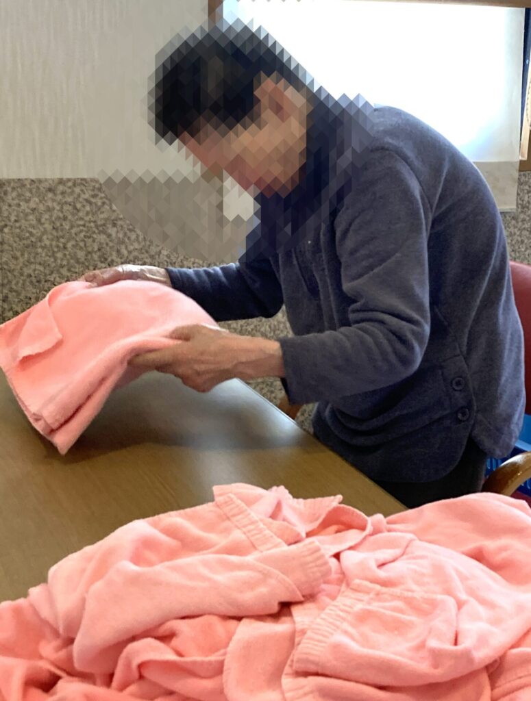 また、1Fショートステイご利用者様だけでなく2F特養でも、タオルや食事に使うエプロンをたたんでいただいております。
