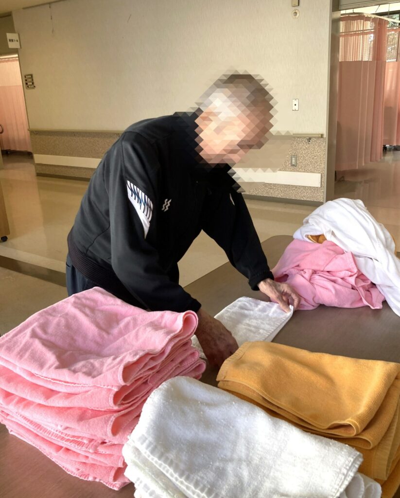 タオルたたみは手先を動かすリハビリになるだけでなく、役割を持つことで意欲向上にもつながります。